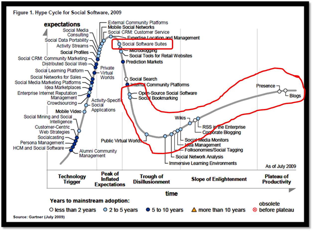 First of all, social platforms like wikis and blogs are all well excepted and are beginning to reach the plateau of productivity. Social software suites (which combine different aspects) are beginning to appear within organisations. It’s these suites which I was going to focus on. Gartner helped me even more by providing a “magic quadrant” for these suites.