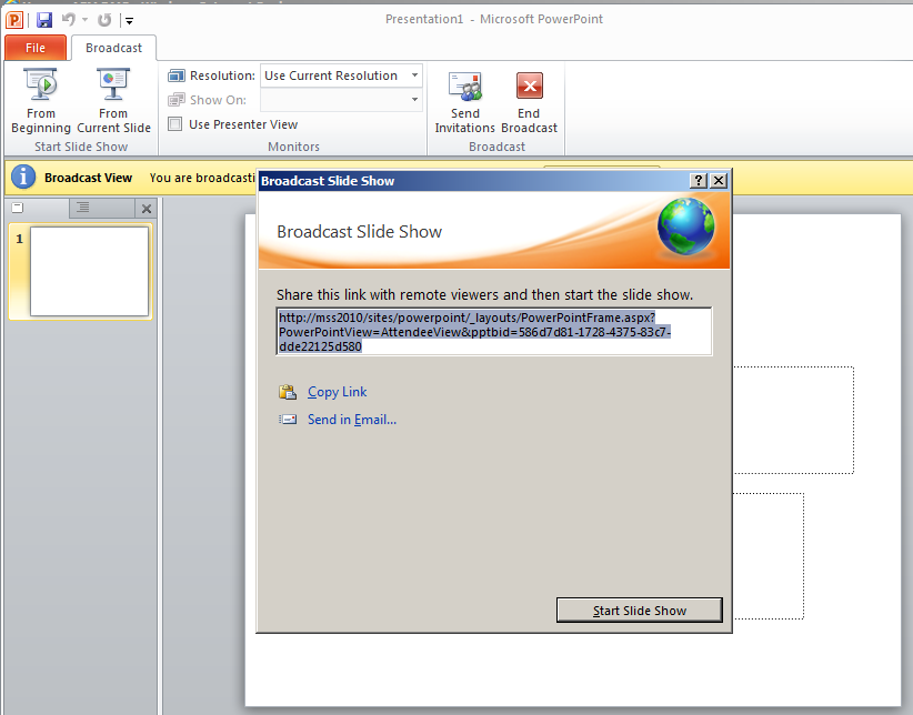 Second, you open up PowerPoint 2010. Let’s assume you already have a presentation you want to share. You simple go to Slideshow | Broadcast Slide Show. You will need to enter the URL to your SharePoint PowerPoint broadcast point (which we created earlier).