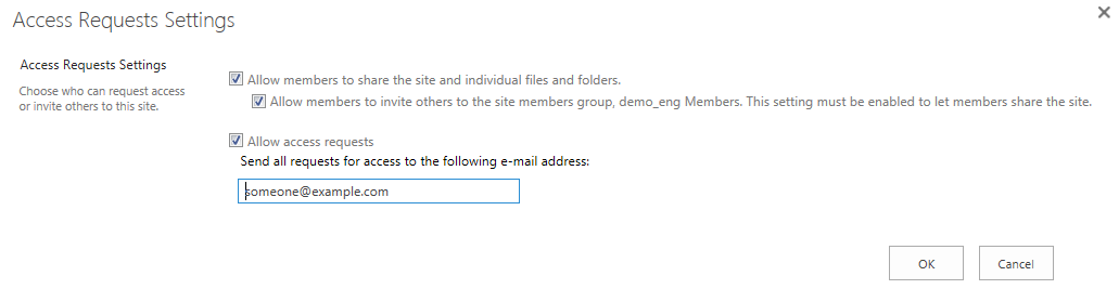 - Site (when the second option is not enabled & Allow access request is enabled): No link is send. Instead, an access request is sent to the mailaddress stated.