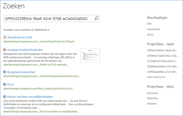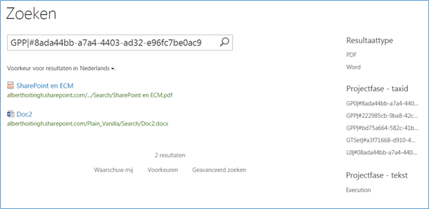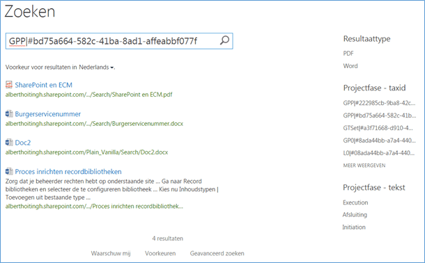 Well, there you have it. Works like a charm. I’ve added the Projectfase term-ids and terms as a refiner. Just for this demo. Which is also nice. You can query all content and have the terms added as refiners. Of course, you will only need to have the readable version there…