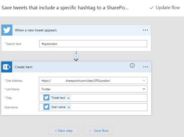 In our demo I created two connections. One was using my Twitter account and the other was my company account, connected to SharePoint Online. Using a Flow out-of-the-box template, I was able to show how easy it is to save Tweets directly into a SharePoint list.
