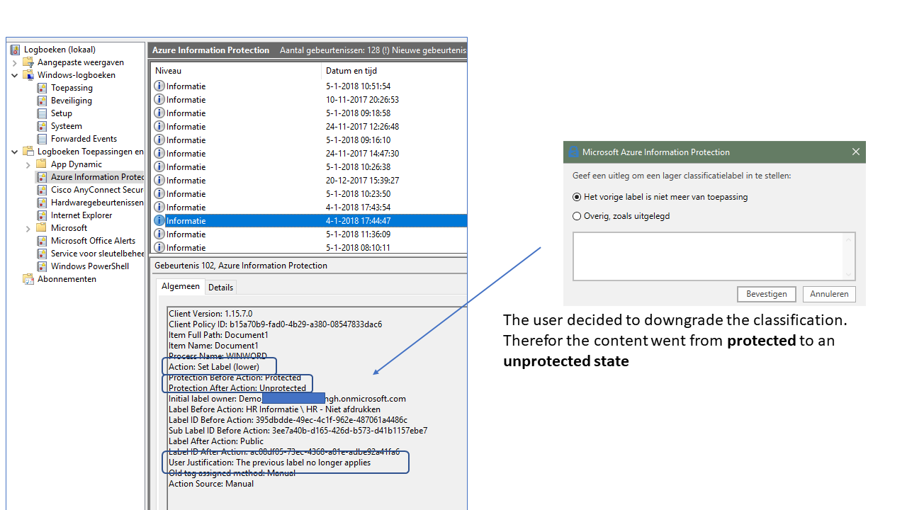 In the Windows Eventlog all Azure Information Protection events can be found. Including the downgrading of the classification. This can be seen below.