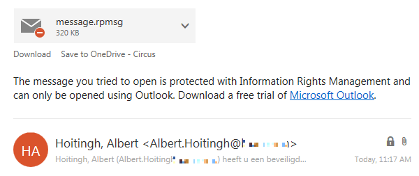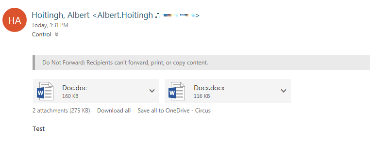 In this case a protected message is sent from Office 365 to Office 365 and Gmail. The standard “Do not forward” action is used. In most cases this went well. One Office 365 recipient could open the e-mail and see the protected content. Notice the Word documents: those are for later 🙂