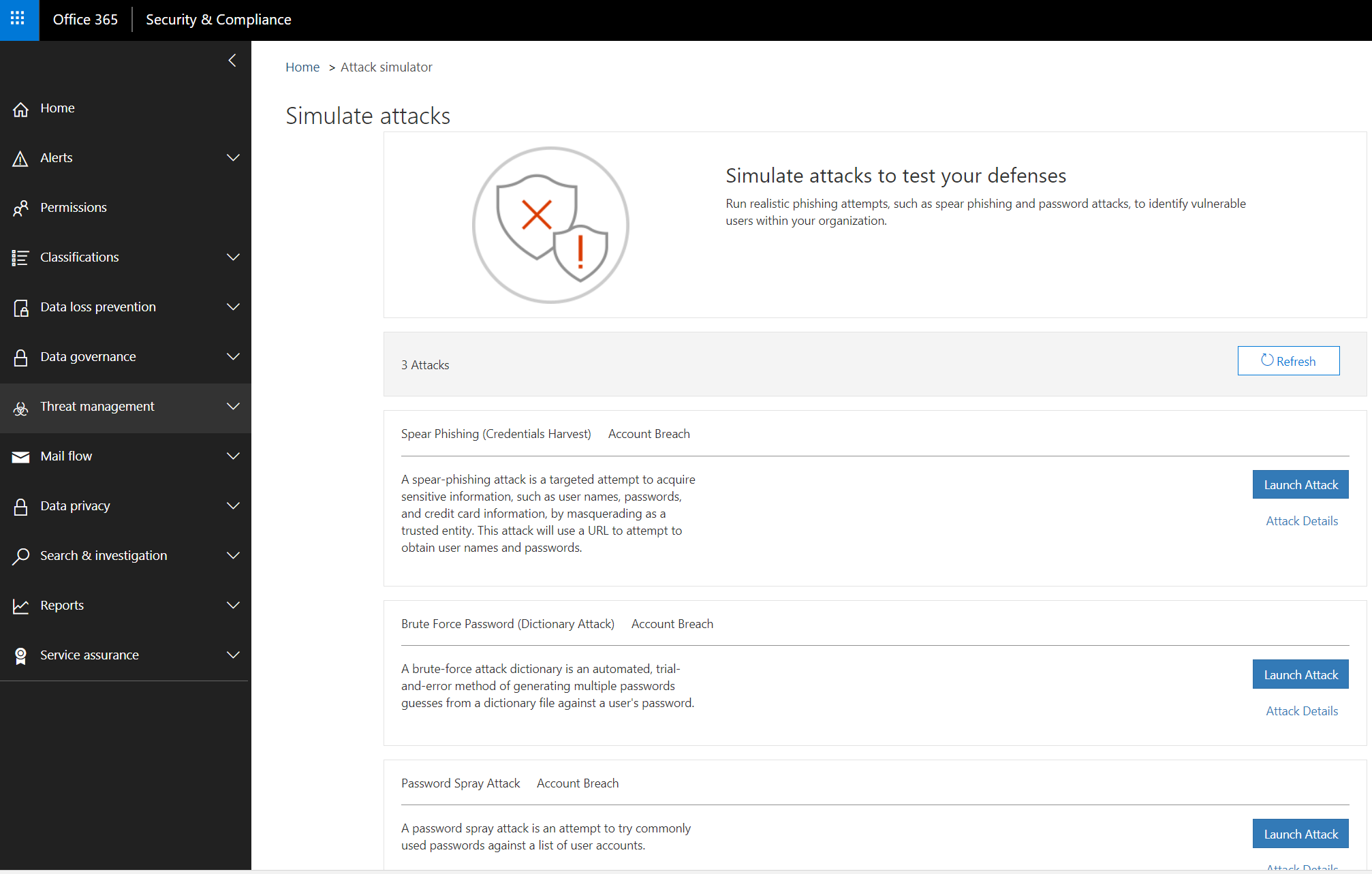 You’ll find the attack simulator in the Office 365 security & compliance center, in the Threat management section.