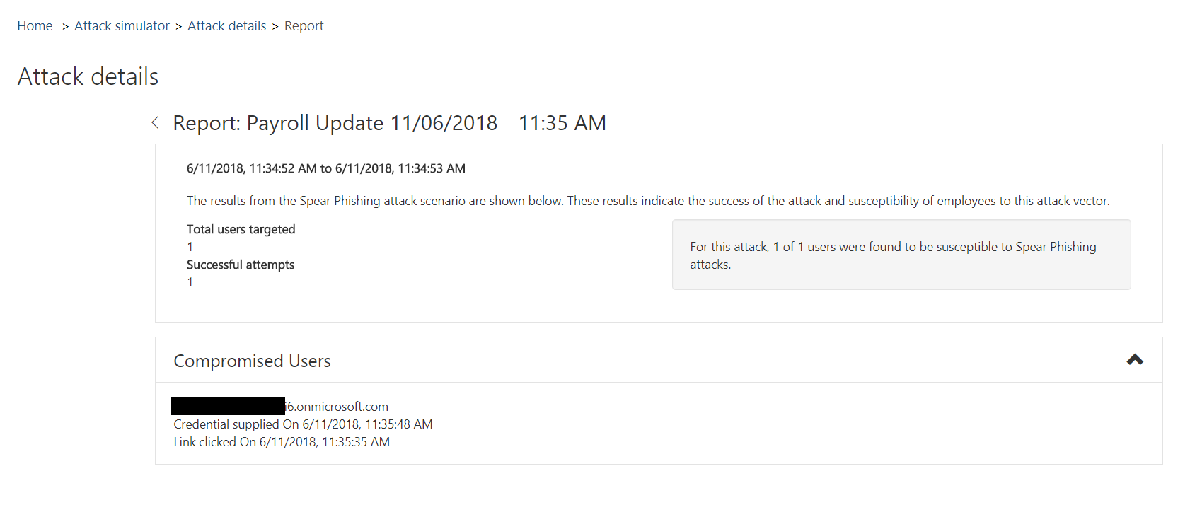 Let’s take a look at the attack simulator. And for this I will focus on one simulated attack: the spear phishing attack. This attack will send e-mails with a malicious link to unsuspected users. Nice 🙂