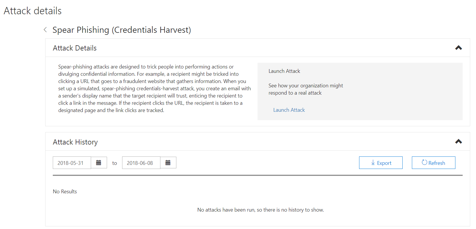 Let’s start the attack, by selecting Launch Attack. This enables us to start the attack and also to see any history of previous attacks.