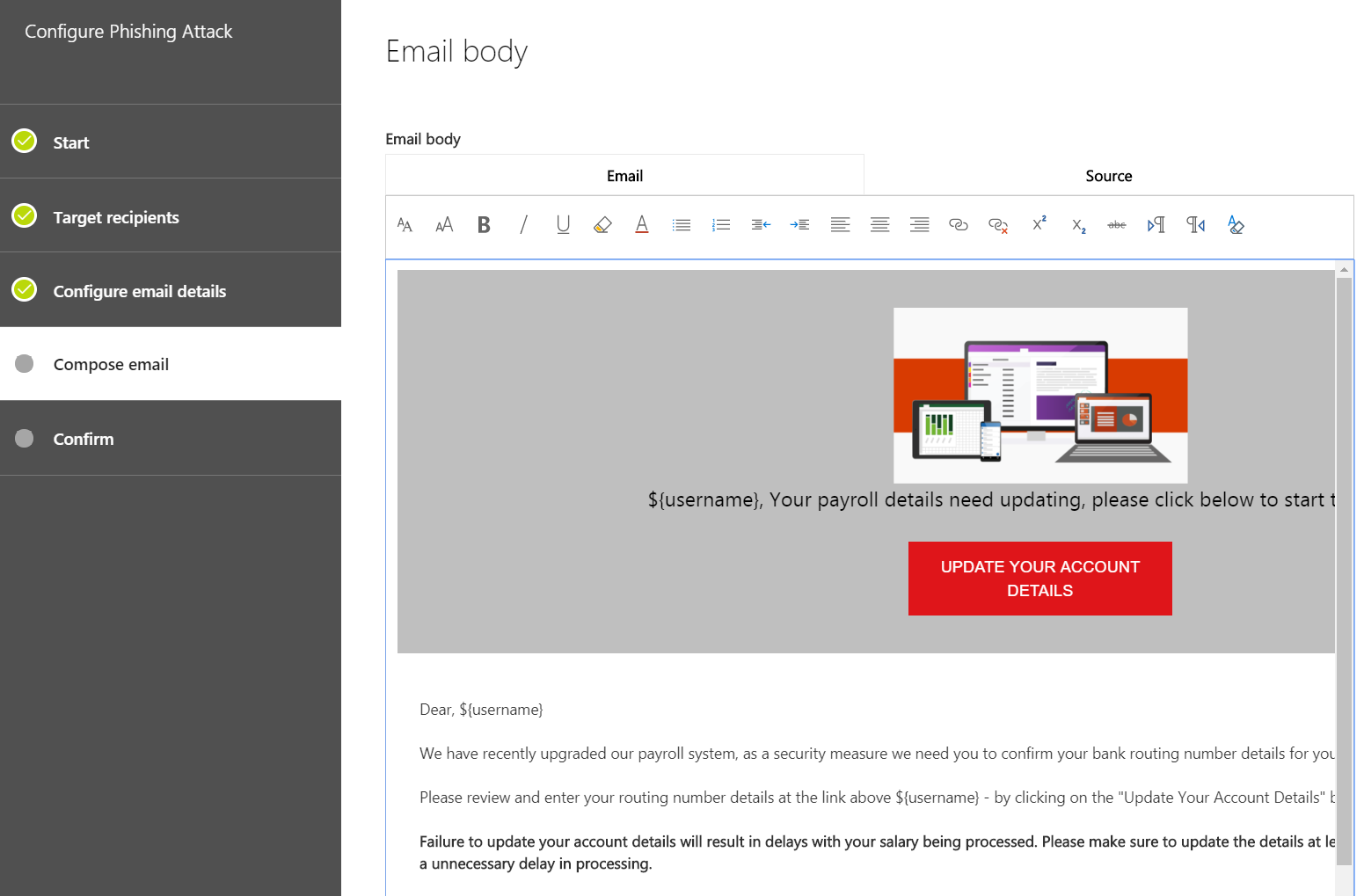 The first thing to do, is to select your “victims”. These are the users which will receive the e-mail. You can add up to 500 e-mail recipients. Next it to create the e-mail details. In this example, I’ll be using the payroll template. This template tries to lure people to a malicious website based on an e-mail from HR. When you select the template, most of the information is filled-in. But one tip: give any attack a different name.