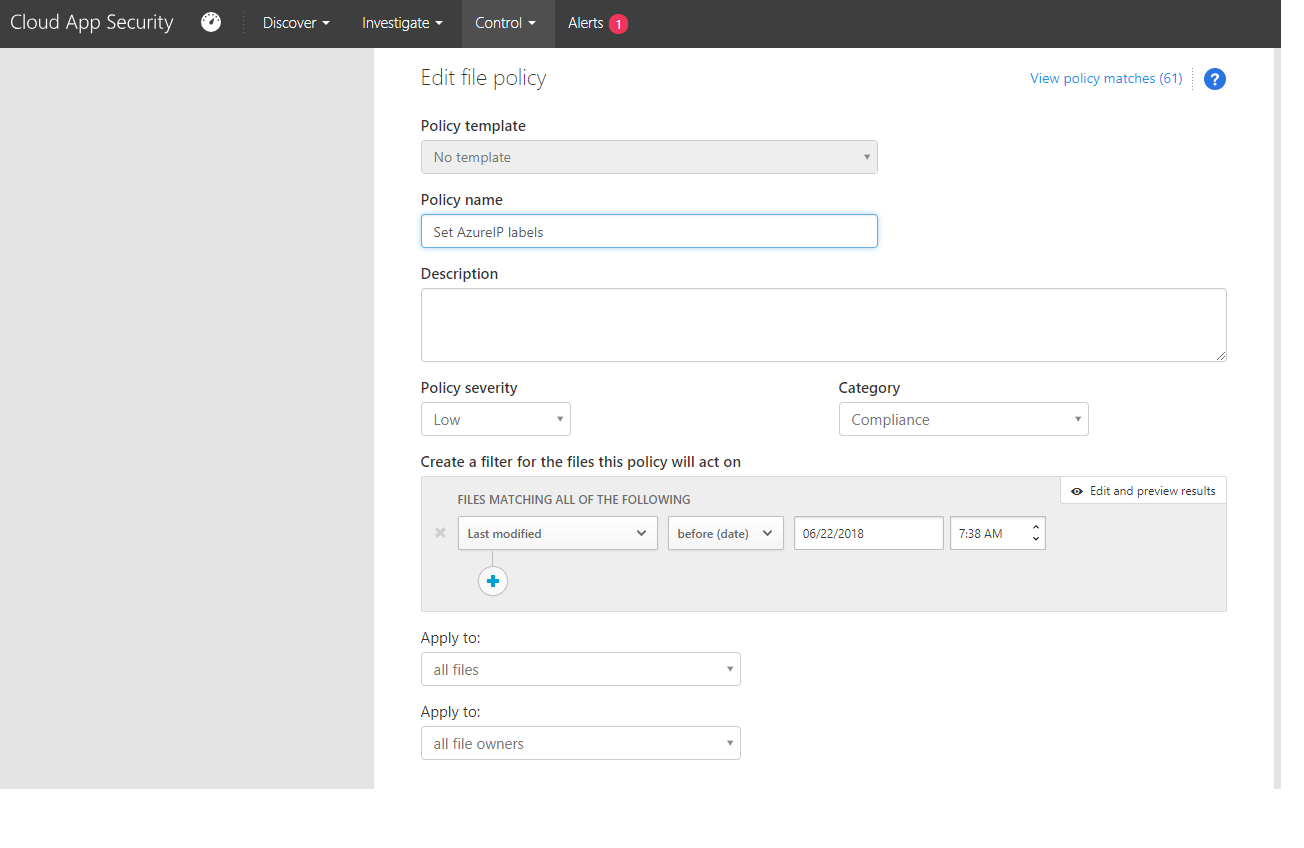 In order to apply an AzureIP label to document, we will need to create a file policy. You go to Control | Policy | Create policy | File policy. As there is no template policy for file-classification, you simply start creating the policy.