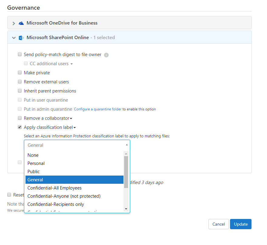 You’re probably also noticing all other options. These are here because the file-policy of MCAS uses an algorithm to search and find all content. When found, these actions can be performed. In other words: you can use these policies as-well for data loss prevention, securing external collaboration and more. Cool stuff!