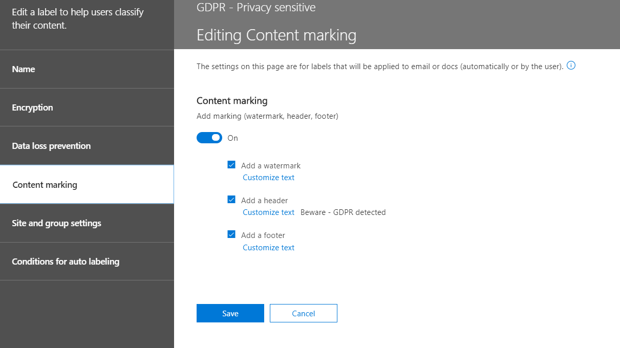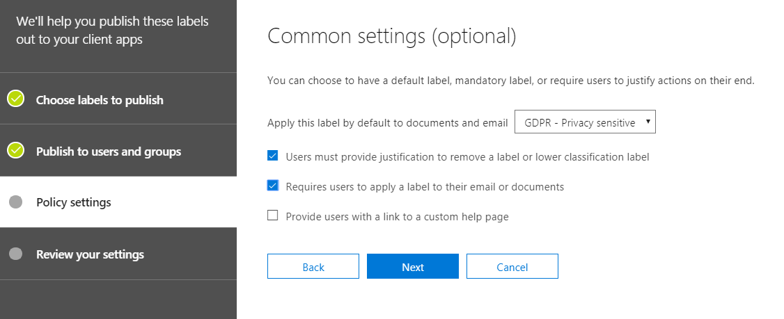 Like the retention labels, sensitivity labels need to be created and published. THese are two different phases. Let’s create a sensitivity label called “GDPR – Privacy sensitive”. You are going to notice that a lot of AzureIP settings are recognizable. Additional options are the Windows 10 DLP and site/group settings.