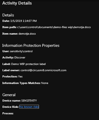When this is set-up, you will be able to review the data on devices. Let’s take a look. The dashboard shows you the locations which have been scanned. Please note: if you have the Azure Information Protection Scanner up-and-running, you’ll also see those repositories here. Cool stuff! In this case, I only have one end-point which is connected to Windows Defender ATP.