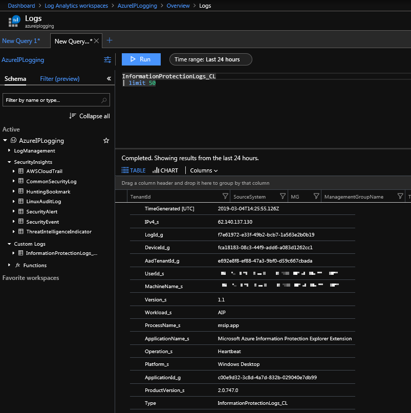 If you want, you can get more detailed information. You will need to delve deep into log analytics itself. When you open the workspace, you can run you’re own query against the data. For data on Azure Information Protection you’ll need to go to Custom Logs | InformationProtectionLogs_CL. Have fun, this is for the enthusiast only 🙂