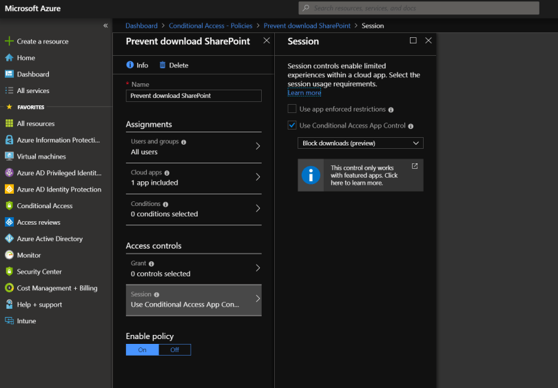 For this post I’ll be using Azure AD Premium 1 and Microsoft Cloud App Security. These are required for this function to work. One of the first steps is to configure the conditional access policy.
