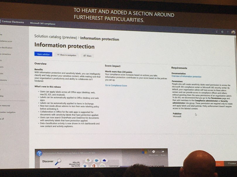 MIP is now going beyond documents. The integration with PowerBI is very cool stuff. You can now classify PowerBI workspaces and the Excel-sheet associated is classified automatically. When using Edge to open a protected document, Edge can show you the permissions natively from the browser. A very nice dashboard now shows you where sensitive information is stored. This was already available in Azure Information Protection, but has been greatly improved.