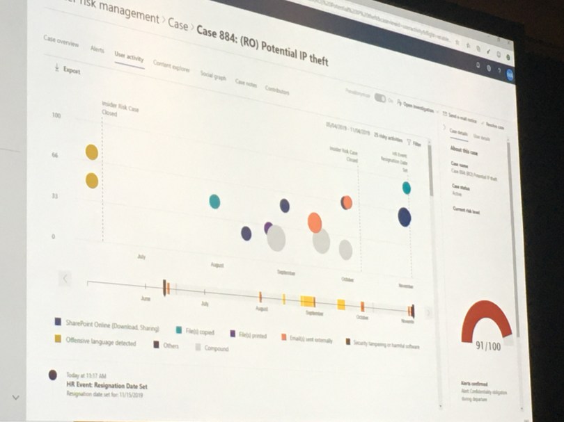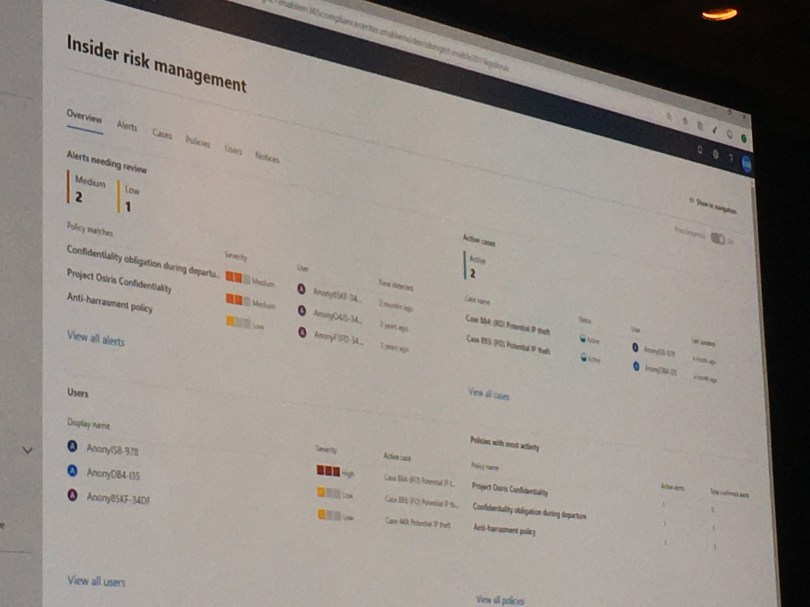 This brings together existing alerts/rules but enhances this by using Delve and even external (3rd party) signals. Using an impressive dashboard, you can now do insider threat hunting based on the activity in Microsoft 365. The dashboard does not show the usernames – by default. These are made anonymous.
