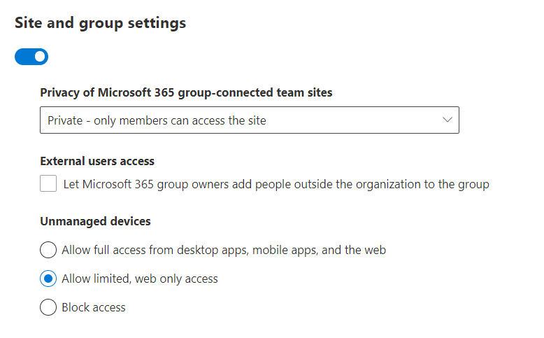 At this moment, you can control the privacy of the site/team, external access and the use of unmanaged devices for this site/team. Which is great functionality.