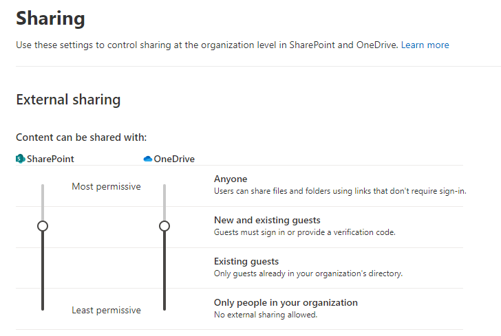 External sharing settings for SharePoint Online and OneDrive for Business control how content (documents, folders) can be shared. The settings range from anonymous sharing to no external sharing at-all. In between you can select the options to share with new and/or existing guest users in your tenant.