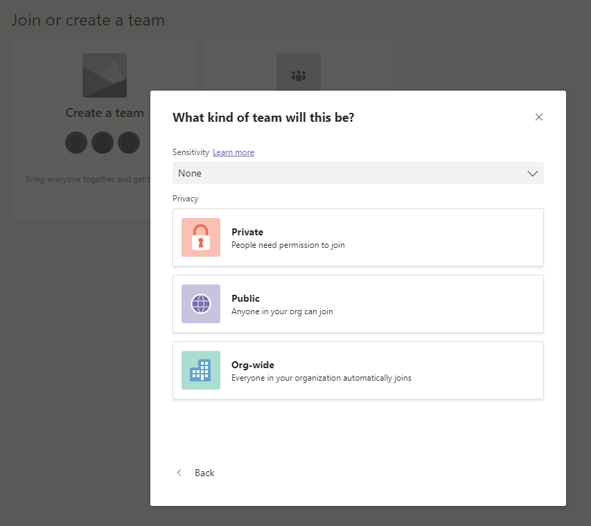 - When creating a team, I can select a range of labels based on the policy. This is correct. However, if the setting for the policy allows me to disregard the label – I can simply select “None”.