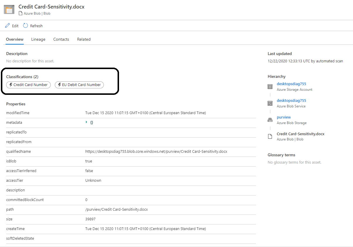 After some time, the scan will present you with the results. And as you can see in the screenshot, many sensitive information has been detected in my blob storage. When the classification is detected based on the sensitivity label, this is also displayed in the example below.