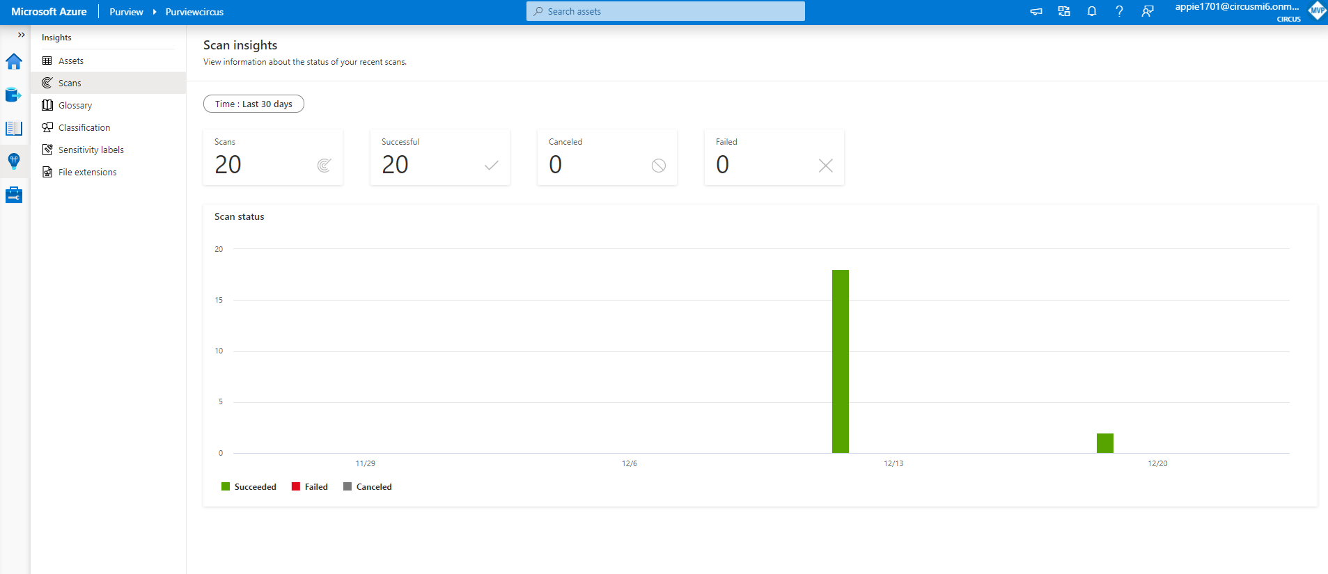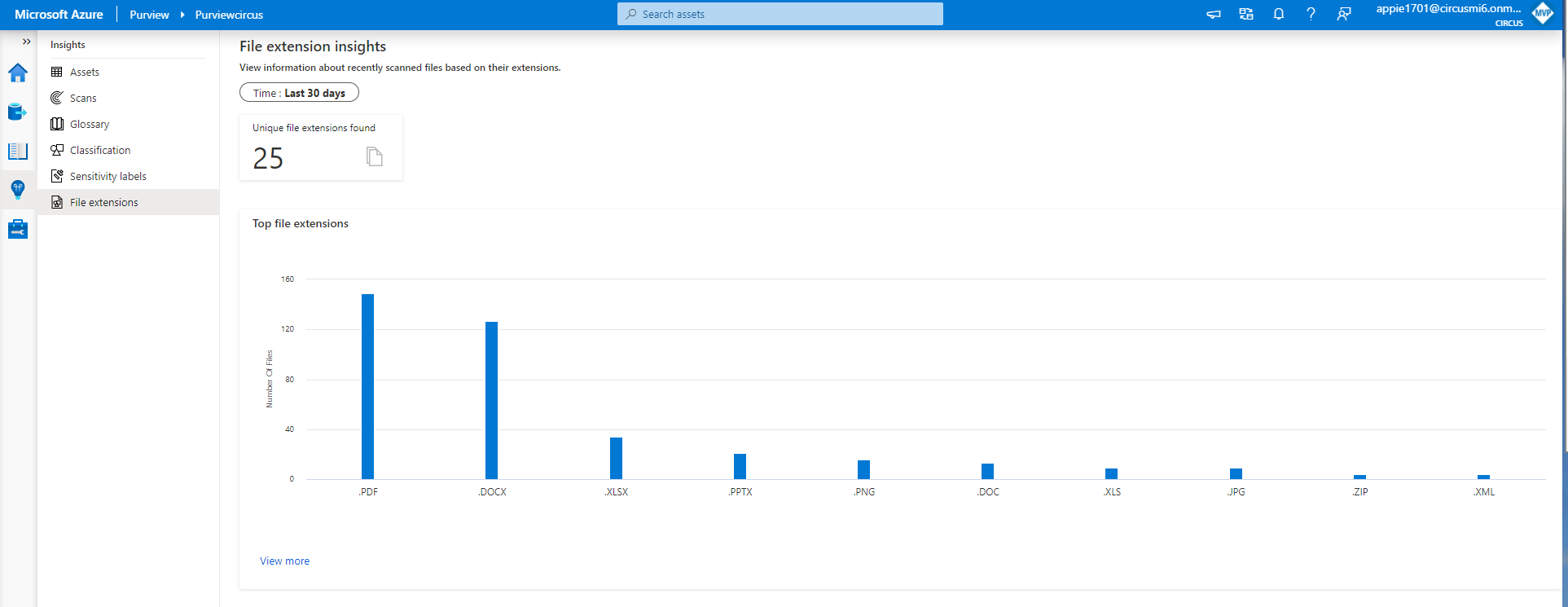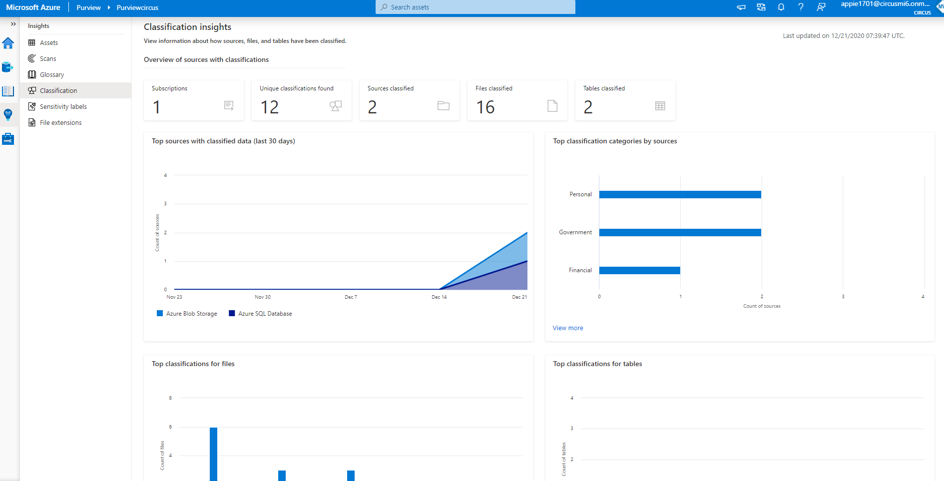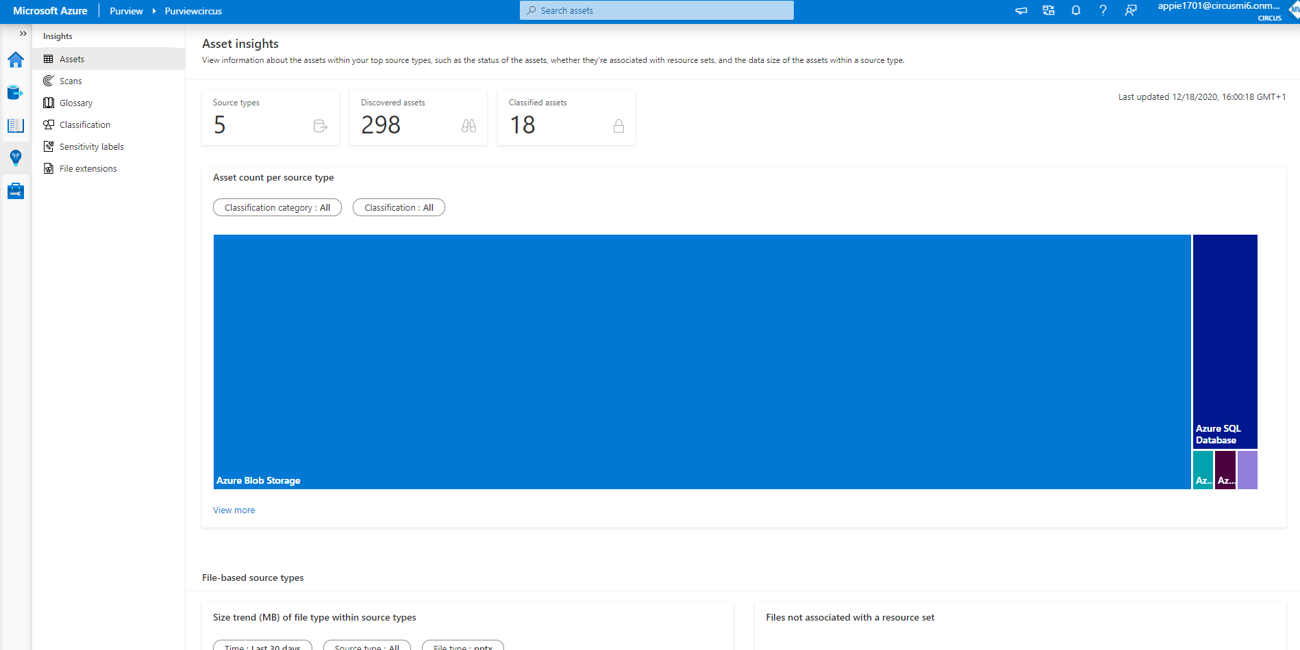 The Insights overview presents the data from your data sources. Here you will find your sources (Assets), an overview of your (running) scan, the glossary (I’ll skip this for now) and the results of the scans: classification information, sensitivity labels and file extensions.