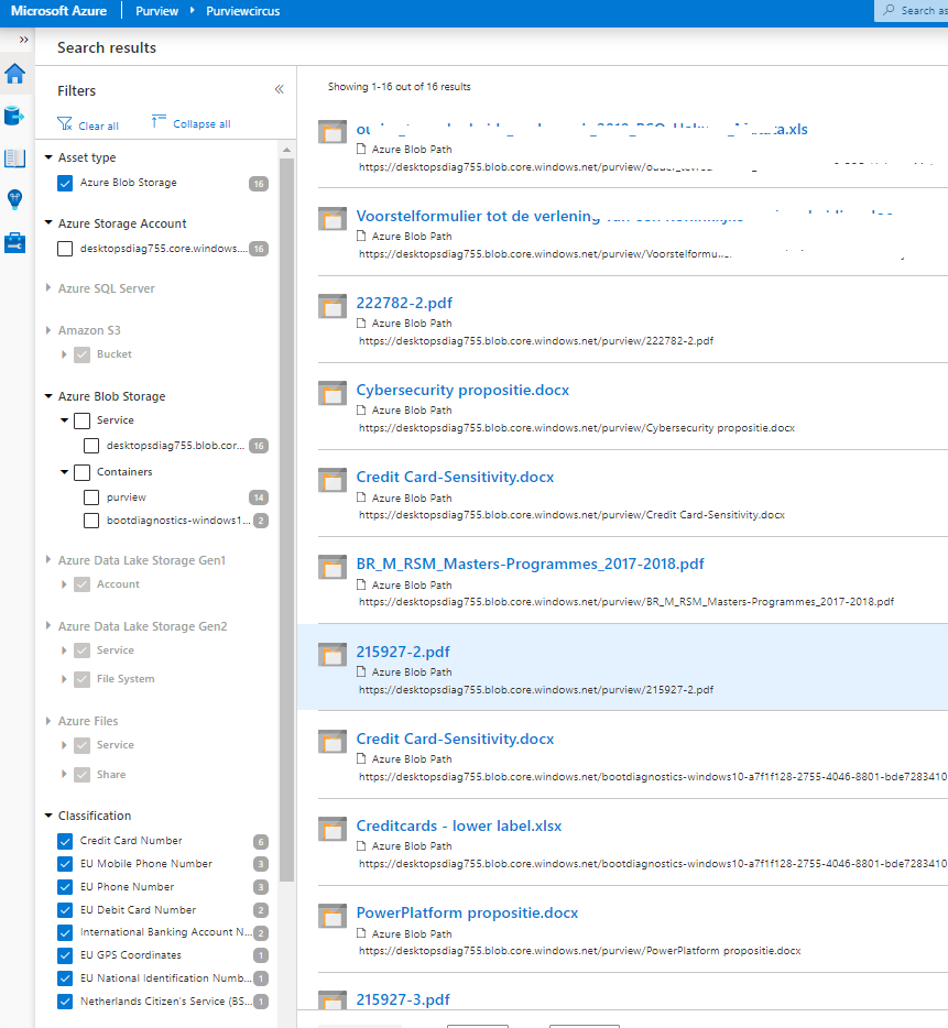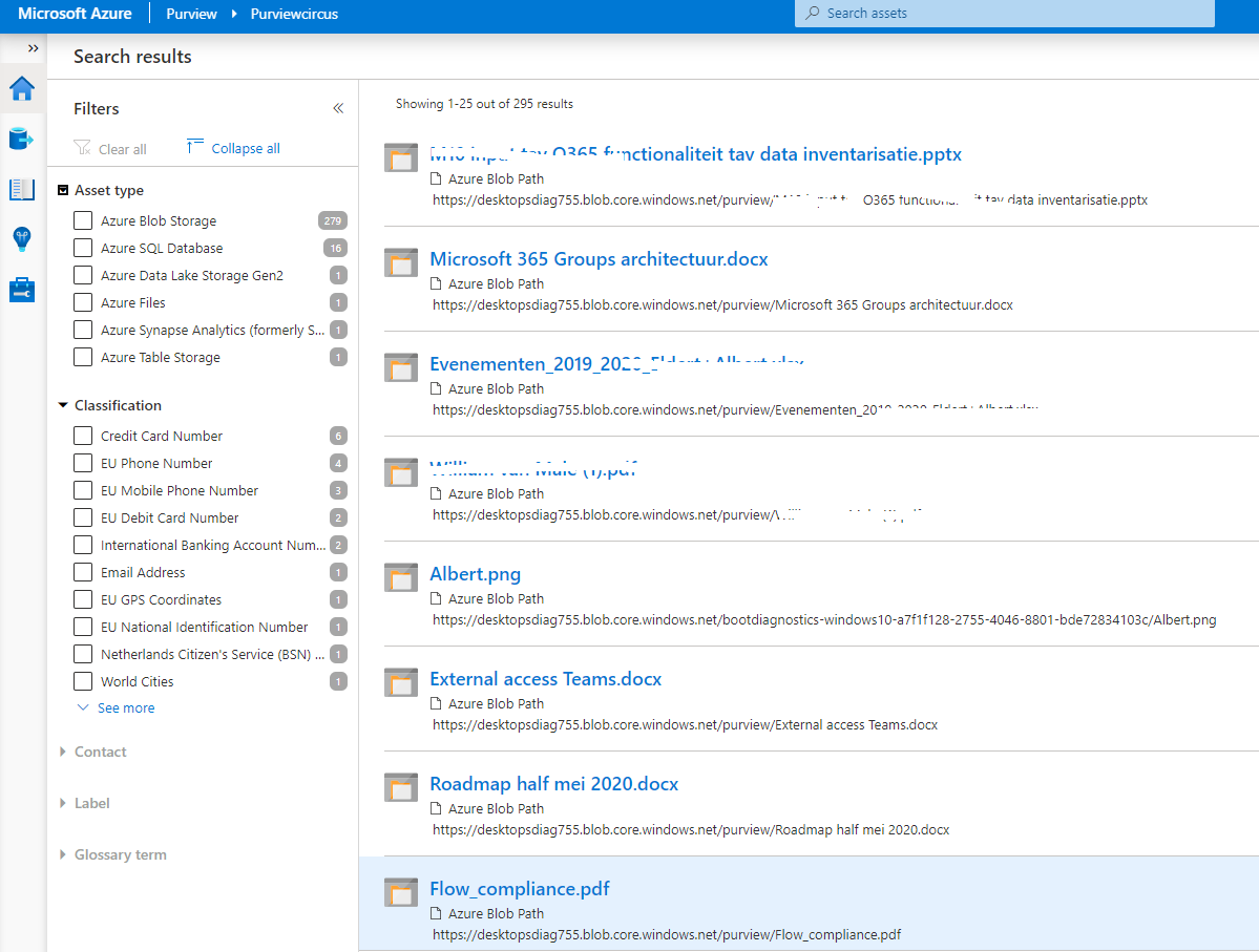 If you go for the classifications, then you will be presented with a nice dashboard of all results. Let’s say you want to look at the classifications for files, then you select View more, select the classification(s) and select Browse assets. You will end up in the search and results section. The classification (and more – labels) are presented as refiners. Just select a document to get the details (location, metadata and more).