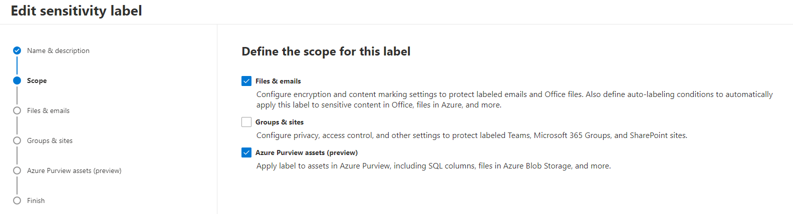 Next, you will need to configure the label. The standard components of the sensitivity label have been augmented with several options. First is the scope. You can now select the Azure Purview assets (preview). This scope is used the label documents and SQL columns. But beware: in order to use this on documents, you will also need to set the scope to Files& emails and define auto-labeling rules for the label! Important this one.
