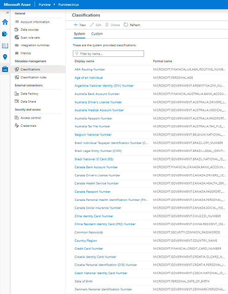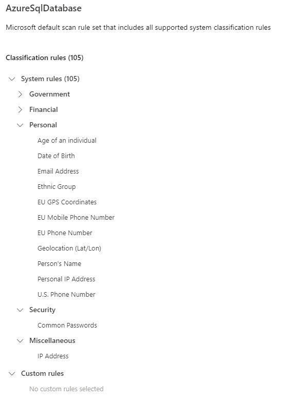 Classification of data is one of the core functions of Purview and the platform offers this by ways of sensitive information types or custom types. These sensitive information types are (mostly) the same as the ones we know from Microsoft 365. But Purview has additional types as-well like the EU Phone Number, World Cities and Person’s name. And you can create new classifications and classification rules (based on regex or custom expressions). But I’ll skip these for now. During a scan of the content-sources, the sensitivity is detected.