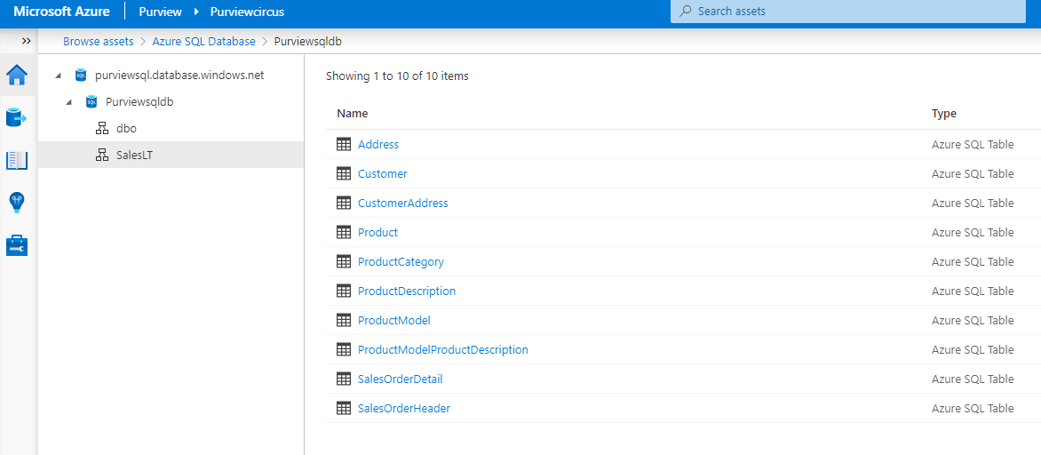 In order to test out this new platform, I decided to use two different Azure storage options. The first was a simple storage account with an Azure blob. I randomly added several files to this location – Office, PDF, images, and so on. The second was an Azure SQL database. I used a sample database for this, just to see how I could connect Azure Purview to this. The database contains information on sales: customers, products and the like. One really nice feature in Purview, you can browse your data sources.