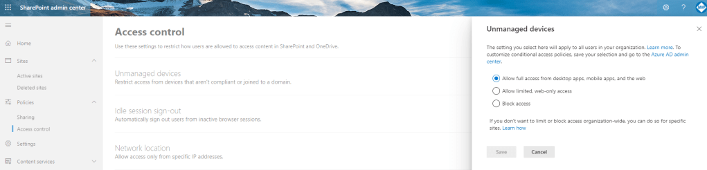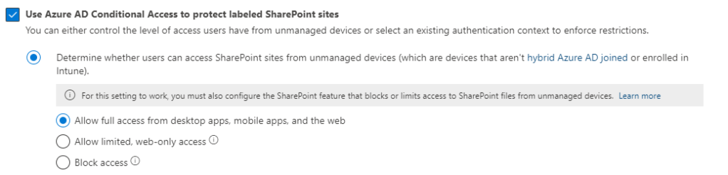 So now we could set the conditional access rule for unmanaged devices based on the site-collection. This was an enhancement, although the options were still limited and at least PowerShell or a provisioning solution was required.