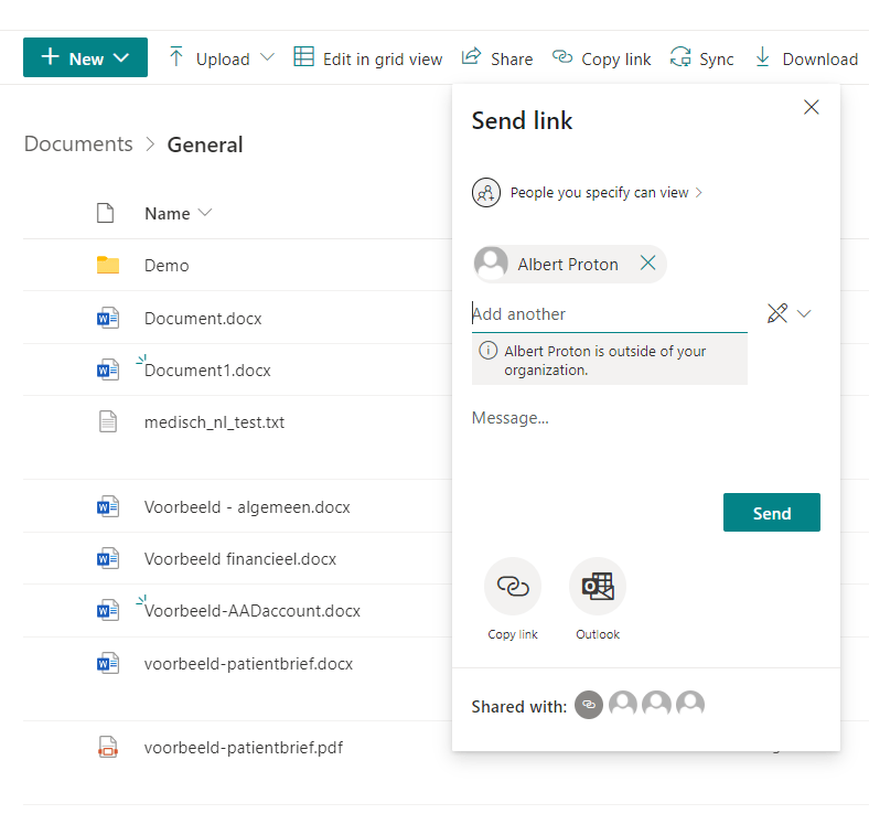 There can be no surprise that these accounts all work with sensitivity labels. But when I would have shared a protected document with the Protonmail.com user, without a Microsoft account attached, I would have received the same message.