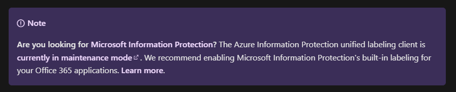 As of 1/1/2022, Microsoft has placed this Unified Labeling client in what’s called a “Maintenance mode”. This means that no new functionality will be developed for this client and all efforts will go towards the integrated client.