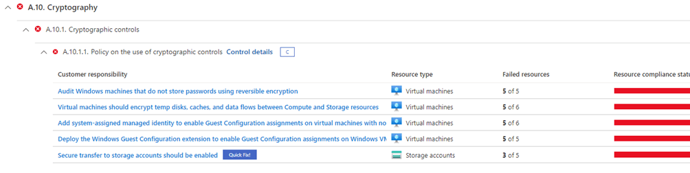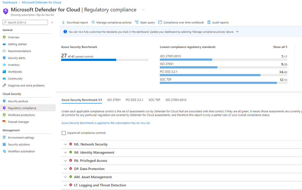 Every assessment (or regulatory standard) has specific compliance controls. And these are displayed below the selected assessment. When these are all green, then you have nothing to worry about. But any red ones should be taken seriously. You can open up any control to see the recommendations and affected cloud resources.