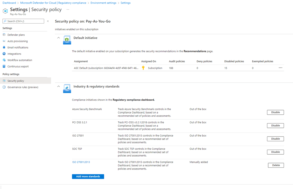 If the default assessments are not enough, you can add additional ones. Beware that this might have a licensing effect. You can add these by going to the Manage Compliance Policies setting, selecting your subscription, and editing the settings.