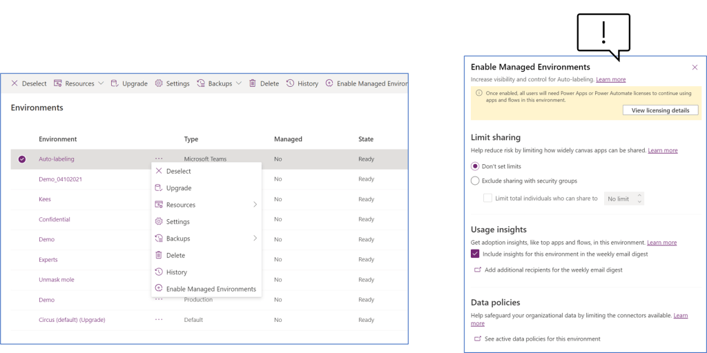 During the session we talked about and showed many components from the admin-center. We also looked at how Dataverse for Teams Apps might result in some unexpected scenario’s – as this requires a specific Power Platform connector and also creates its own environments.