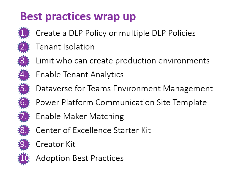 At the end, we concluded with several best practices. All best practices were described (and some demo-ed) in detail.