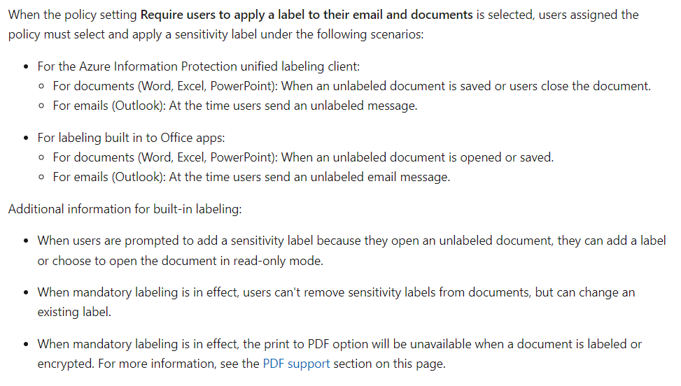 But beware. The built-in client also acts differently sometimes. A good example of this is the mandatory label setting. When using the unified labeling client, this check for a mandatory label is done when the document is saved or closed. But the built-in client checks when the document is opened (or saved)!