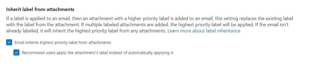 Also, label inheritance from email attachments is in preview. This feature will check the label on email attachments and apply the highest label to the email itself. This is configured in the Information Protection policy.
