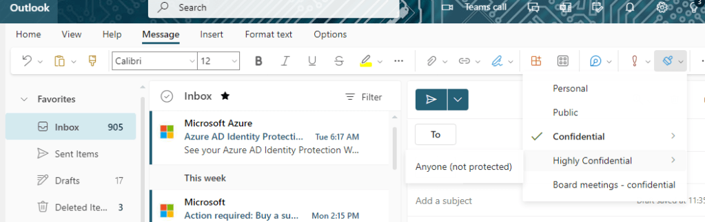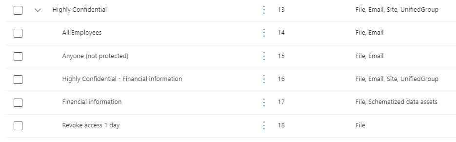 In this example, we can see the Highly Confidential labels. Most are scoped to documents and emails. The labels Financial information and Revoke access 1 day have not been scoped to email and this is the result in Word and Outlook:
