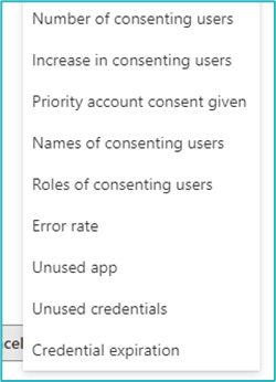 - Permissions: Unused credentials, Overprivileged app, New app with non-Graph API permissions, New highly privileged app, Expiring credentials;