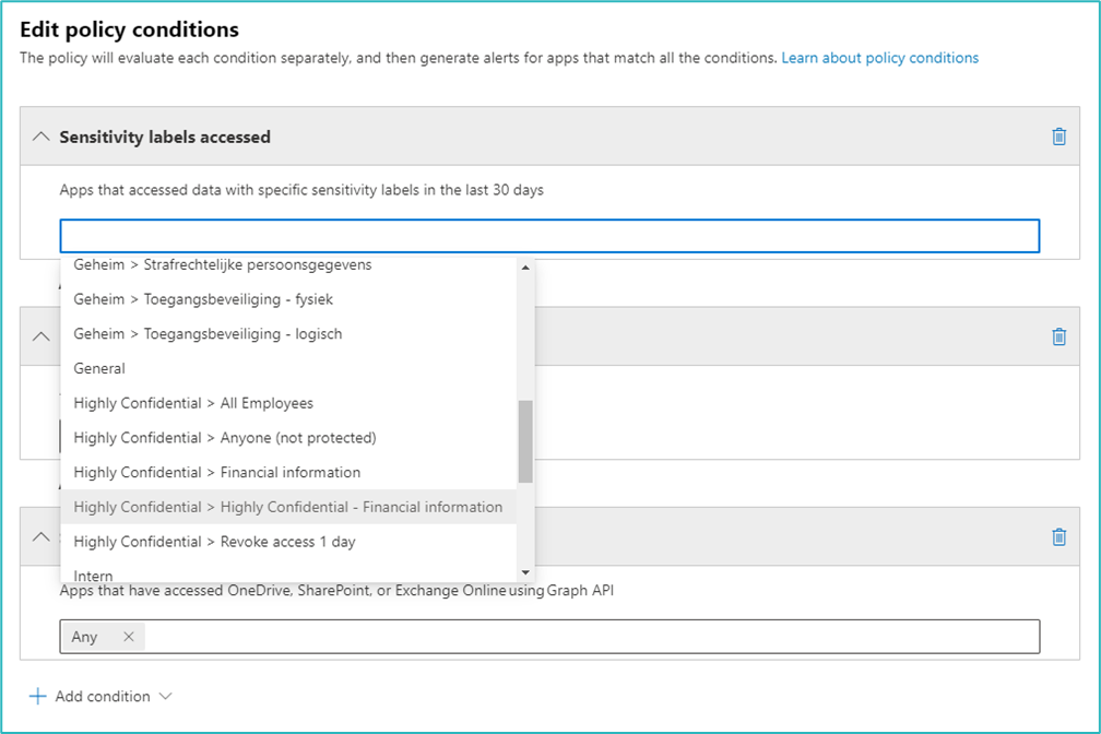 The policy can be set to act on specific applications. By default, these are all oAuth (registered) applications, but you can either select specific ones or exempt specific ones. Next, you’ll be able to set the policy conditions. And here you have a wide range of options.