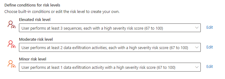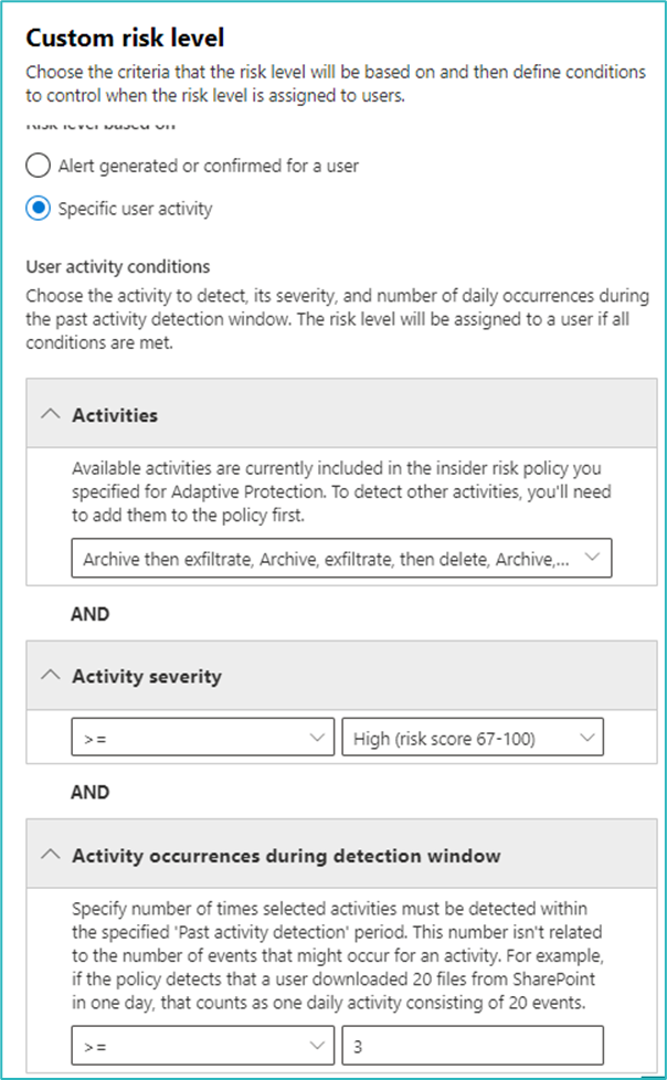 The built-in Adaptive Protection policy for Insider Risk Management (the default for use in DLP) comes pre-configured. The risk level of an end user (Evelated | Moderate | Minor) is determined based on the number of high severity exfiltration sequences (at least three) or high severity activities (two or one).