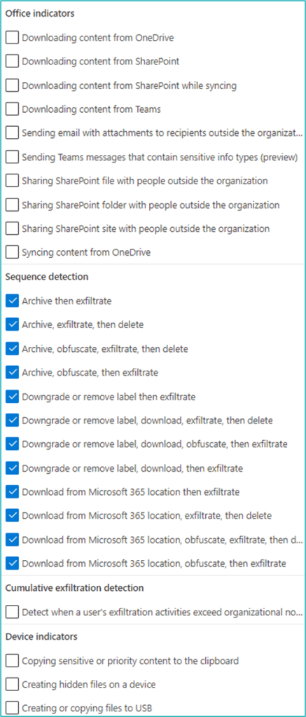 This default policy is set to act on the sequences to Download from Microsoft 365 location then exfiltrate and Detect when a user’s exfiltration exceeds organizational norms. These norms are configured in the policy.