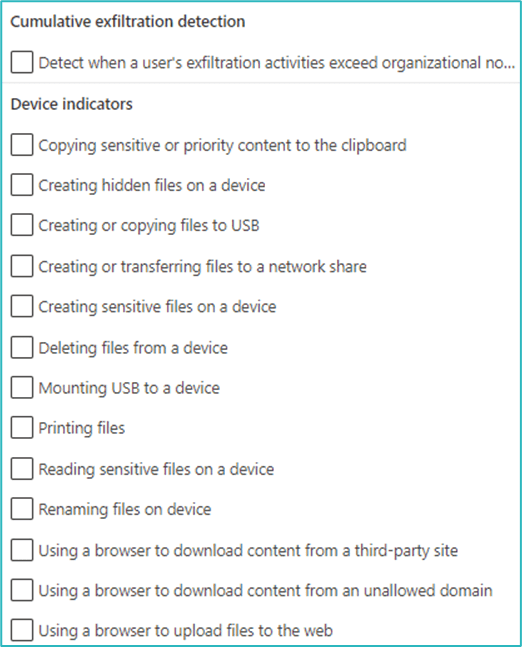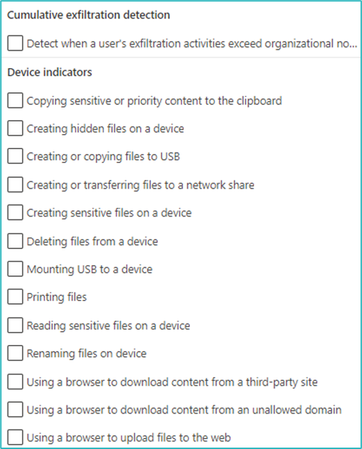 These are the indicators that Defender for Endpoint will detect and send to Insider Risk Management. Note: you will need to onboard these devices to Insider Risk Management first.