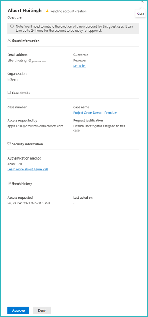 The eDiscovery administrator can now either approve or deny the request. These requests can be accessed by going to eDiscovery (Premium) | eDiscovery (Premium) settings | Guest users.