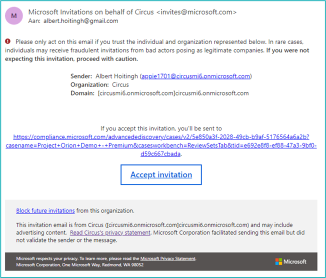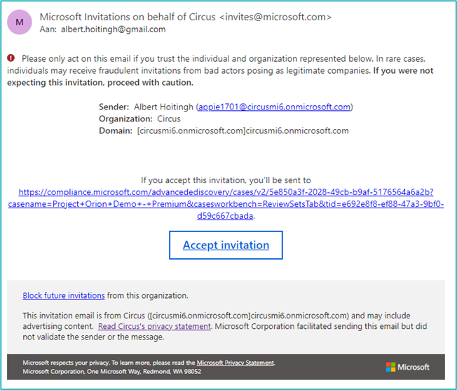 From the guest user’s perspective, he/she will receive an invitation to join the eDiscovery case. I must admit, this might be somewhat clearer for the guest user. And this is an understatement.