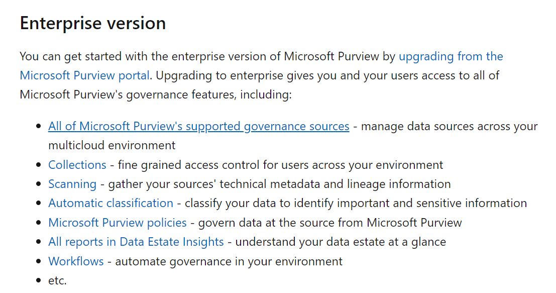 But this Free vs. Enterprise option is related to the structured data component of Microsoft Purview. And this uses the Free option (which includes the components of Data catalog | Data share | Data map history) and the Enterprise version. Which offers: