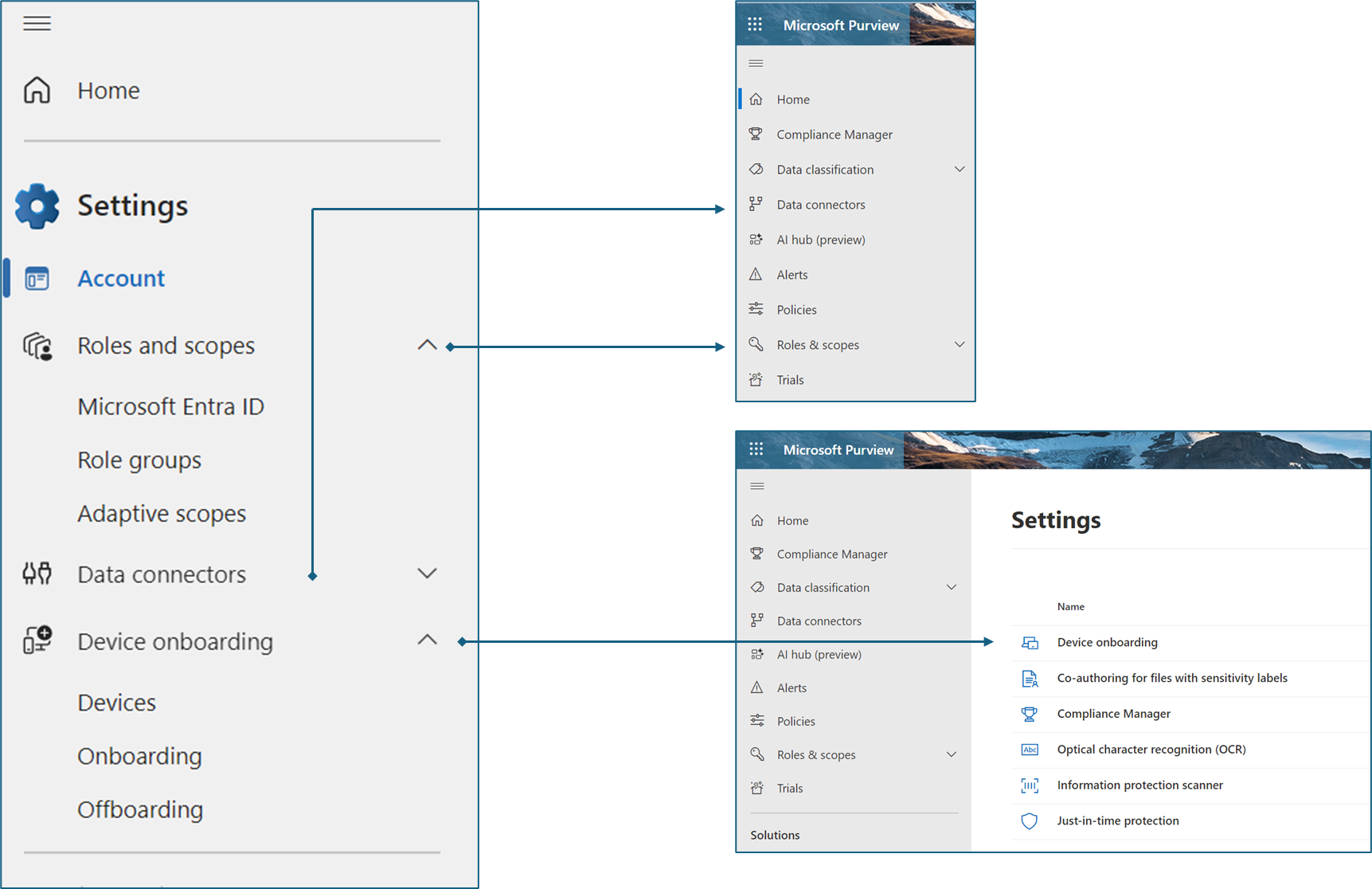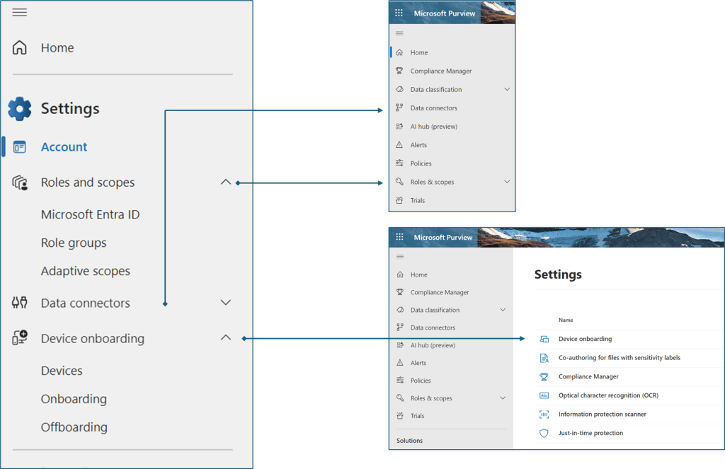 Let’s start with the look and feel of today. For the current compliance center, you go to https://compliance.microsoft.com. The structured data Purview is part of Microsoft Azure: https://portal.azure.com/#view/HubsExtension/BrowseResource/resourceType/Microsoft.Purview%2FAccounts and https://portal.azure.com/#view/HubsExtension/BrowseResourceBlade/resourceType/Microsoft.DataCatalog%2Fcatalogs