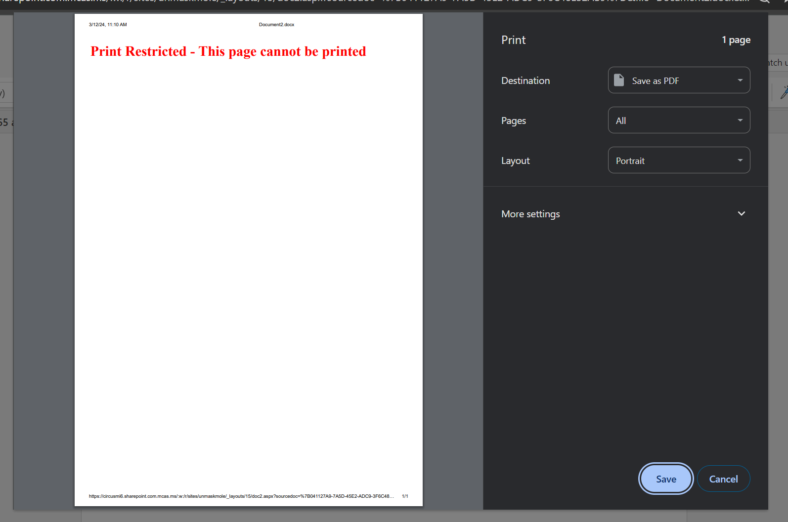 Also, this option is not limited to sensitivity labels. The conditional access rules used by the label can also be applied to specific SharePoint Online sites using PowerShell. The settings in the label offer the required features: disable download, print or sync files. So this is the one? Not entirely – remember the bonus-requirement? This setting will not block those pesky guests from using <CTRL<P> to save or print the sensitive content.