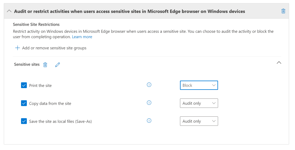 As the client uses Microsoft E5 licenses, so there is not much in the way of limitations. But some options are disqualified right away. For example: Endpoint DLP. Endpoint DLP allows us to monitor and even restrict specific actions that will meet the requirement. Yeah!