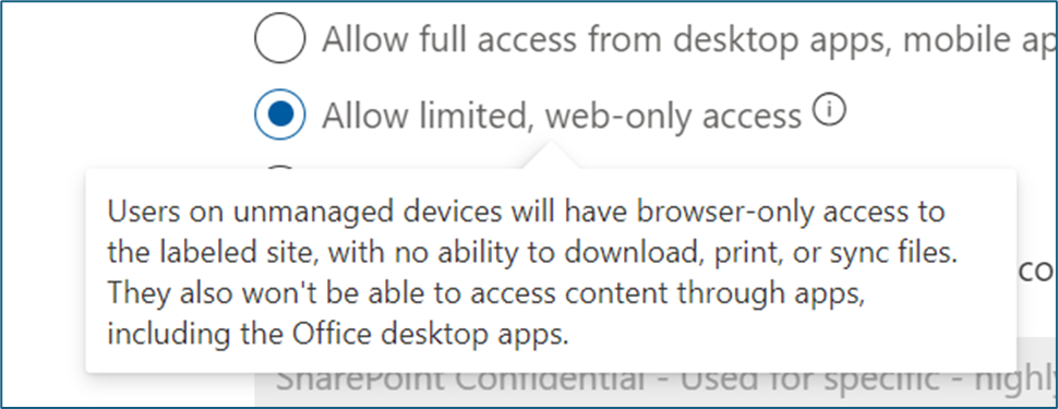 Now we are working with sensitivity labels, why not look at labels on the item (document) level? When combined with the labels on the container level, this might we a working solution. A sensitivity label applied to a document will block copy/paste and print actions . When a document is opened in the Microsoft 365 app, the label will even block any screenshots.